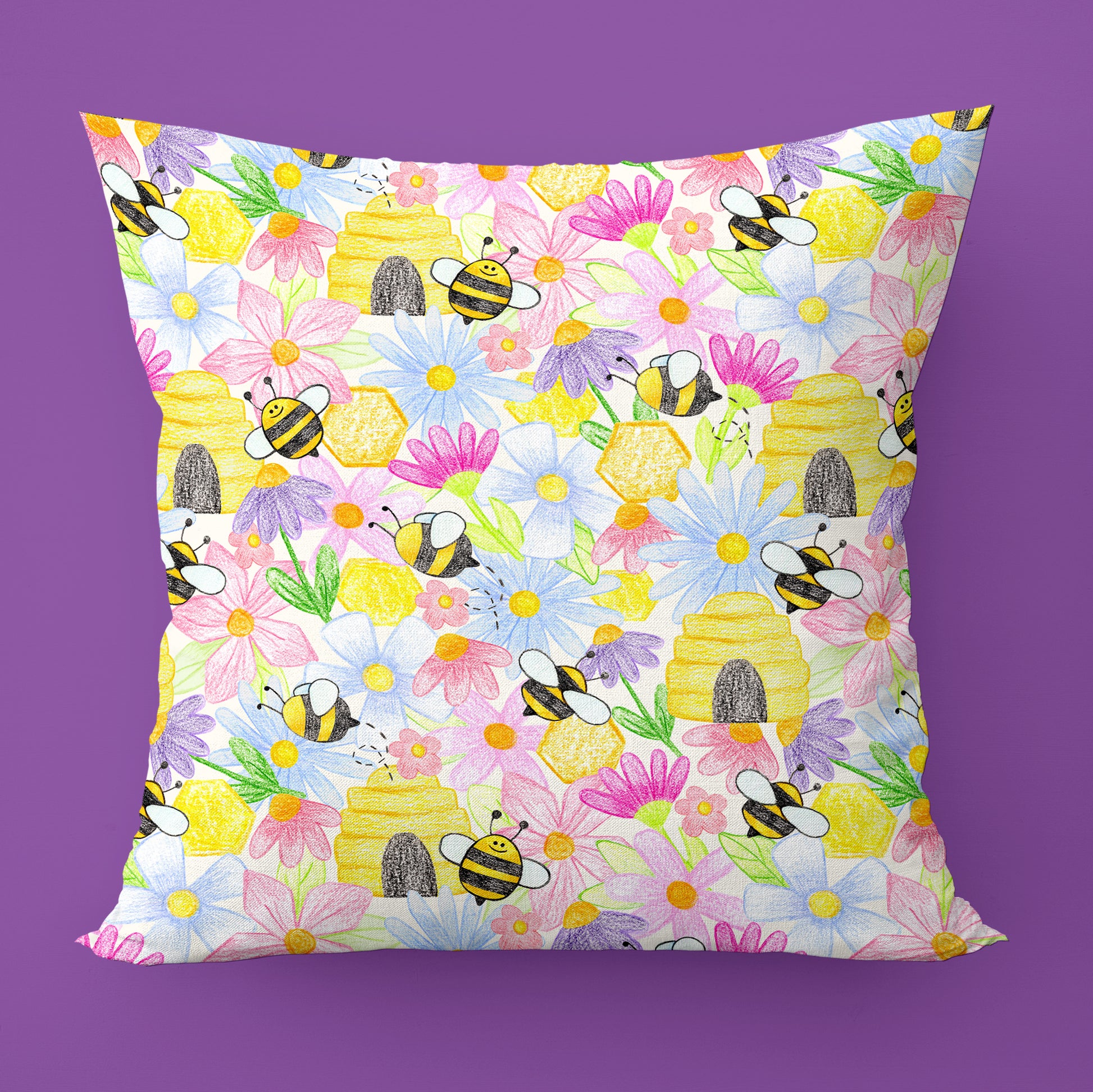 A bright and colorful honeybee pattern is just what your child's room needs. This 100% poly poplin pillow has this pattern on the front and back and is cut, sewn, printed and shipped from the USA. The insert is 100% poly fiber filling.