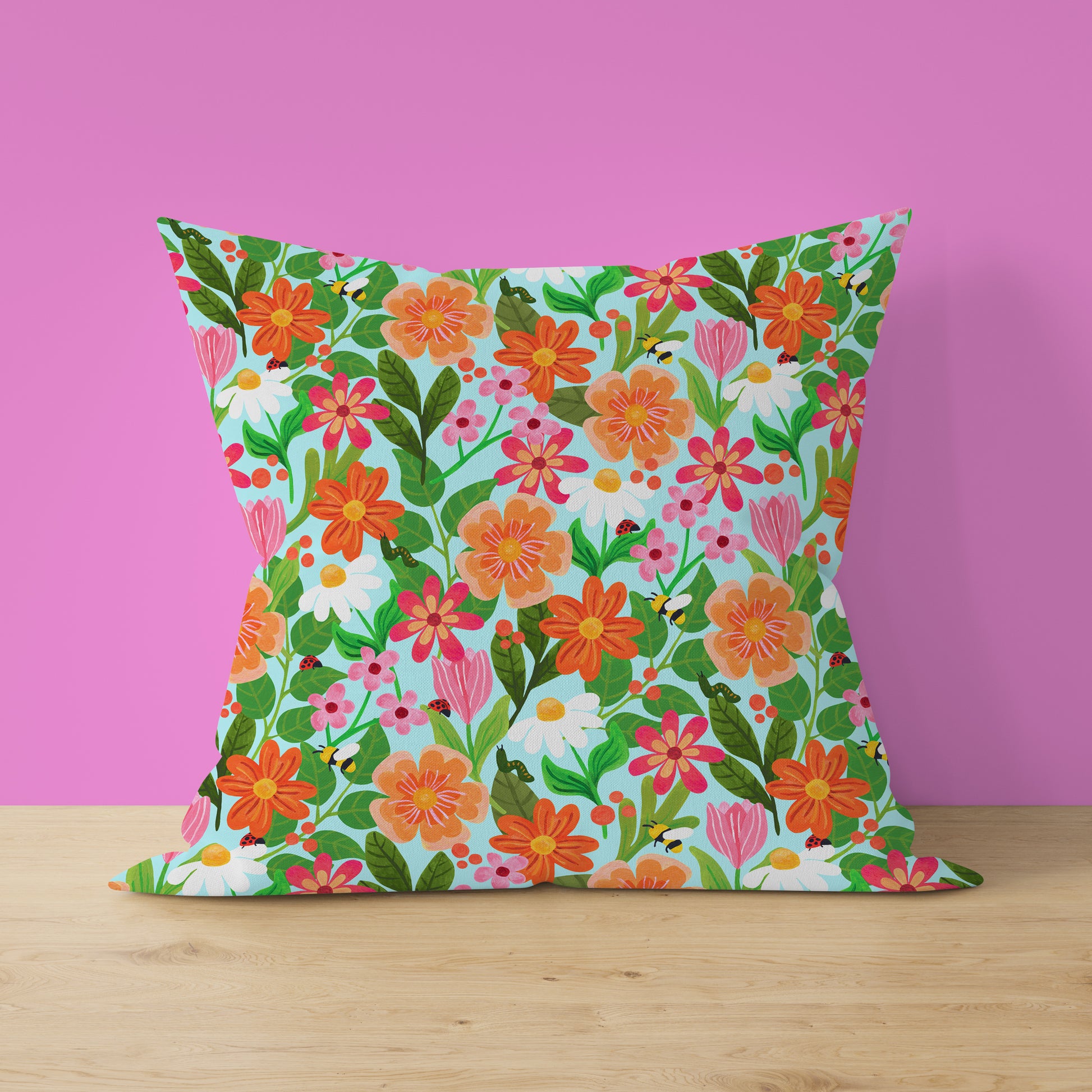 Bring the garden inside with this pretty throw pillow. This 100% poly poplin pillow has this pattern on the front and back and is cut, sewn, printed and shipped from the USA. The insert is hypoallergenic 100% poly fiber filling.