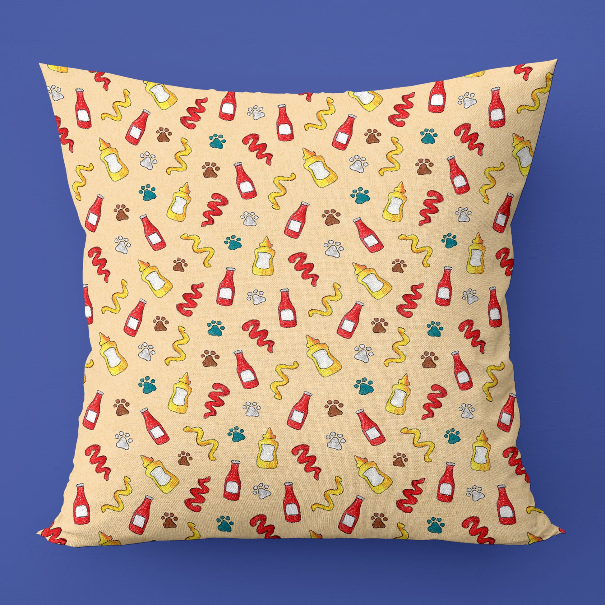 Add some ketchup and mustard to your decor this hot dog days of summer. This 100% poly poplin pillow has this pattern on the front and back and is cut, sewn, printed and shipped from the USA. The insert is 100% poly fiber filling.