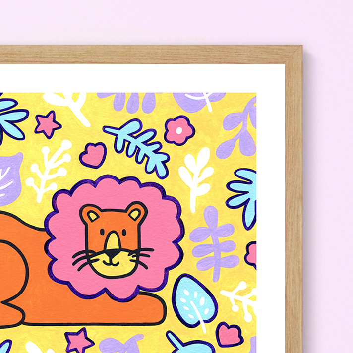 This little lion is surrounded by pops of colorful flowers for a fun and whimsical print. This 12x16" art print is printed on a smooth, heavy weight, and archival 100% cotton paper that is both acid and lignin free. This product is unframed.